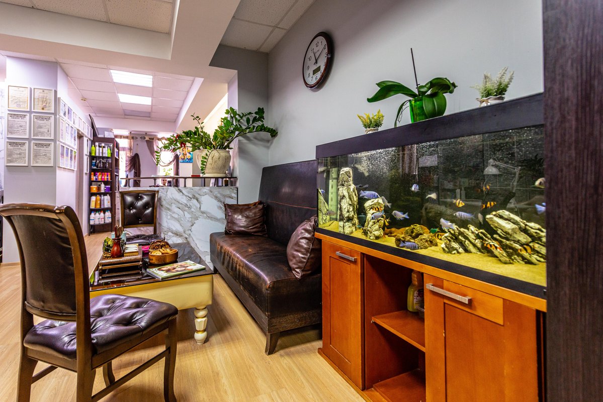 Отличное место! Стригут быстро, точно так как и просили, очень приятный интерьер и красивые рыбки).